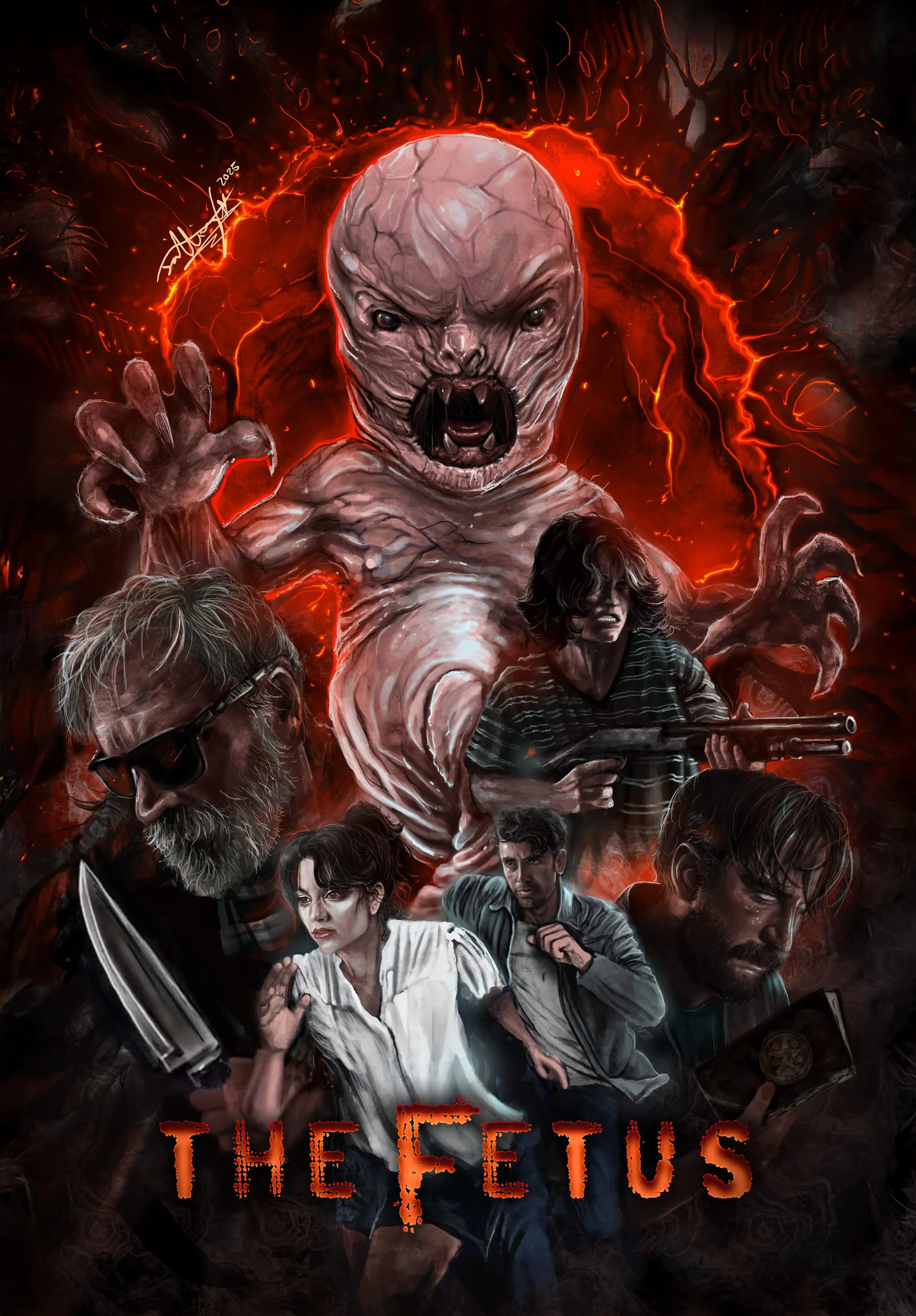 The Giant Fetus Reveal Poster (Group Cast Edition) showcases the most iconic and shocking imagery from The Fetus. Centered around the towering giant fetus creature, this illustrated one-sheet brings together the film’s ensemble cast in a bold, cinematic composition.